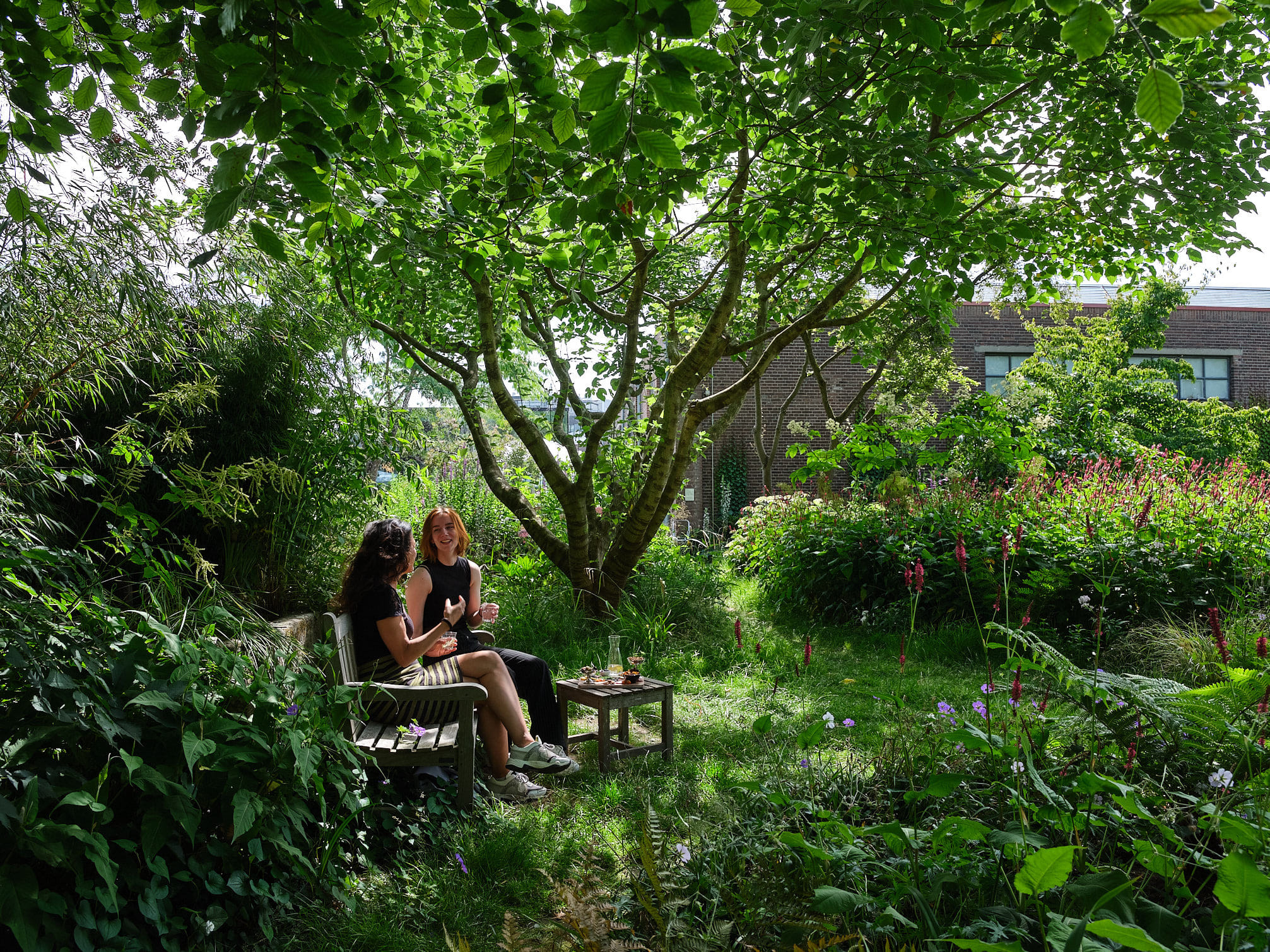 Achter een bakstenen muur ligt de museumtuin van De Pont Museum verscholen. Een rijke, wilde tuin die als een oase van rust onzichtbaar is vanaf de straat, midden in het industriële Tilburg. De tuin is alleen bereikbaar via het terras van het museumcafé en biedt ruimte om ongestoord te reflecteren op de kunstcollectie en tentoonstellingen, of om simpelweg te genieten van het groen en de stilte.