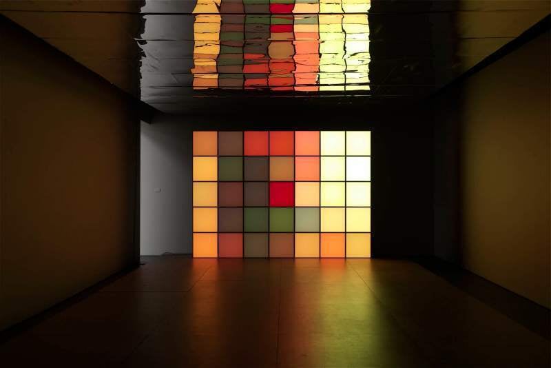 - 35 pixel boxes, elk 50 x 50 x 50 cm, houten plateau en spiegelend plafond elk 700 x 500 cm