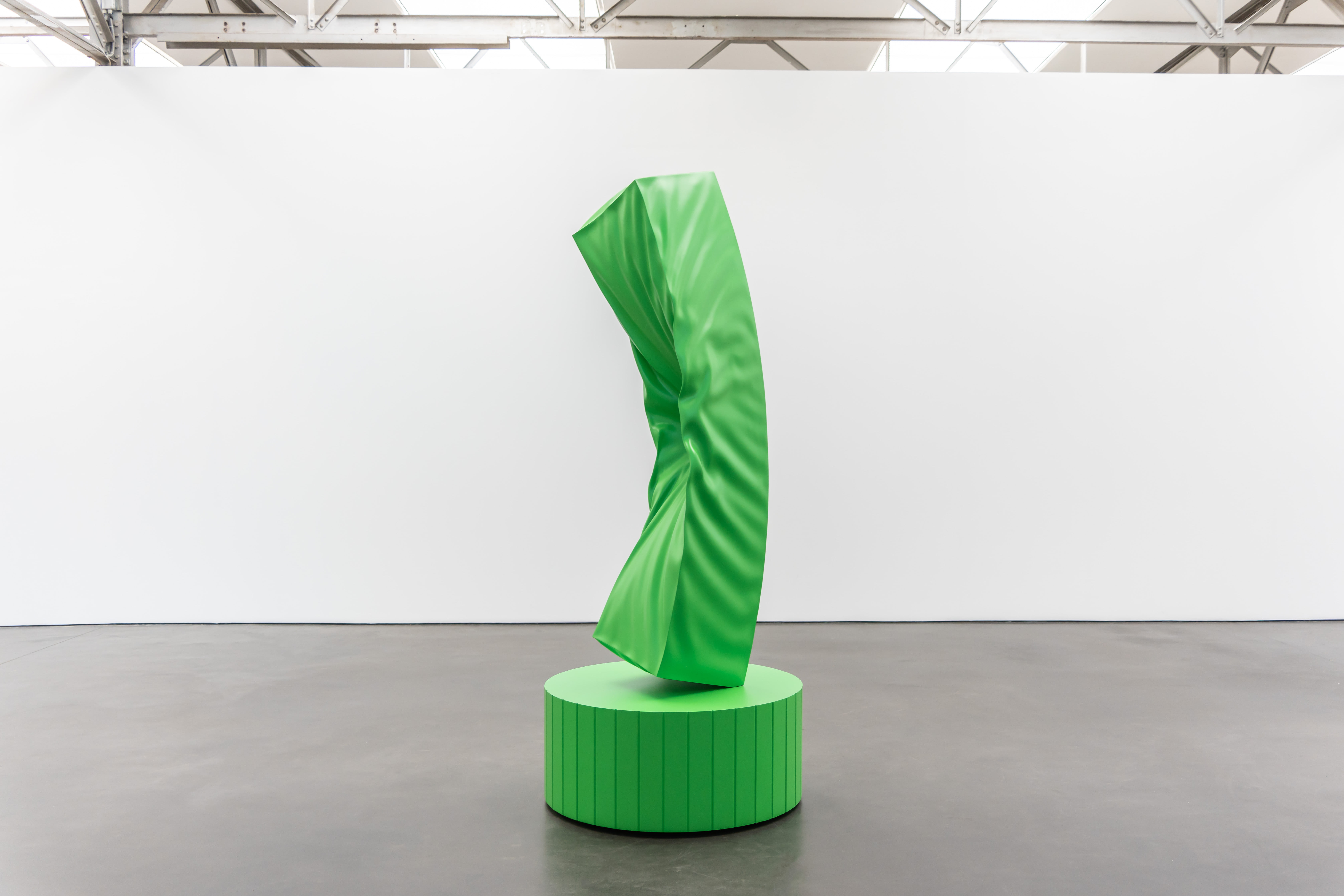 GUT PUNCH/Little Island v. 1 (1.1) is een beeld dat je maar moeilijk loslaat. De manshoge sculptuur lijkt net niet te bezwijken na een frontale inslag, die je als kijker bijna fysiek kan navoelen. Maar tegelijkertijd staat het werk met zijn glanzende groene oppervlak en welvende plooien, bol van de verleiding. Welk geweld, vraag je je af, veroorzaakte zo’n aantrekkelijke schade. En waarom? Is Deans werk een afrekening met minimalistische sculptuur? Een commentaar op klassieke monumentale waarden, op de fallus wellicht?