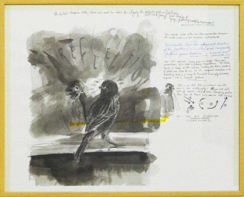 David Claerbout onderzoekt in zijn werk de impact van het verstrijken van de tijd op onze waarneming. In zijn films speelt hij met bewegend en stilstaand beeld om een andere wereld, een ander gevoel van 'zijn' op te roepen. Het werk kan refereren aan een bepaalde plaats of gebeurtenis, maar de tijdslijn is onduidelijk en men kan zich zowel in het heden of verleden wanen. Claerbout besteedt veel aandacht aan de details in zijn werk, met beelden en scenes die ongelooflijk precies zijn geconstrueerd, in een productieproces dat zich over jaren kan uitstrekken. Voor elk van zijn filmprojecten maakt hij een aantal tekeningen, zoals deze voor het tweeschermige videowerk Breathing Bird, die hem helpen na te denken over het concept en er meer grip op te krijgen.