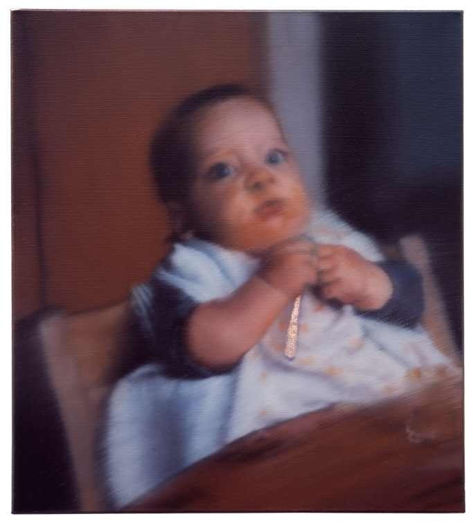 De twee portretten van Moritz laten een van gezondheid blakende baby zien die aan een eettafel zit. Hij heeft een grote slab omgekregen tegen het morsen en in zijn handjes houdt hij een lepel. Hij lijkt net gegeten te hebben en kijkt ons met grote ogen aan. Het is een tafereel zoals dat waarschijnlijk op ontelbaar veel kiekjes in miljoenen fotoalbums terug te vinden is. Maar het huiselijke kiekje is hier niet alleen een liefdevol document van de kunstenaar en zijn zoon; het is een uiting van de ongelooflijke vitaliteit van de schilderkunst. Richter heeft het werk in twee versies gemaakt. Het kleinste doek is meer realistisch, het grotere is veel minder uitgewerkt en daardoor abstracter. Bij beide werken valt op hoe mooi en effectief de verfbehandeling is; in de fluweelzachte babyhuid, in de licht-donker verhoudingen, in de stofuitdrukking en het glinstereffect van de lepel, maar vooral in de verwonderde blik en de grote ogen van het kind. Een blik die misschien nog wel het meest doet denken aan die van het Meisje met de parel van Johannes Vermeer. De lichte schrik die uit deze ogen spreekt, spiegelt wellicht onze eigen verbazing tegenover deze twee kleine meesterwerken.