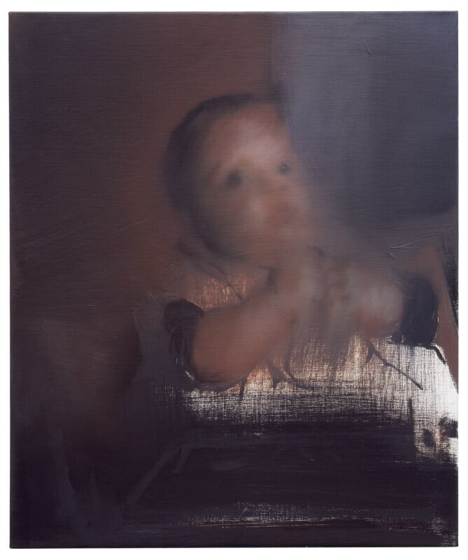 De twee portretten van Moritz laten een van gezondheid blakende baby zien die aan een eettafel zit. Hij heeft een grote slab omgekregen tegen het morsen en in zijn handjes houdt hij een lepel. Hij lijkt net gegeten te hebben en kijkt ons met grote ogen aan. Het is een tafereel zoals dat waarschijnlijk op ontelbaar veel kiekjes in miljoenen fotoalbums terug te vinden is. Maar het huiselijke kiekje is hier niet alleen een liefdevol document van de kunstenaar en zijn zoon; het is een uiting van de ongelooflijke vitaliteit van de schilderkunst. Richter heeft het werk in twee versies gemaakt. Het kleinste doek is meer realistisch, het grotere is veel minder uitgewerkt en daardoor abstracter. Bij beide werken valt op hoe mooi en effectief de verfbehandeling is; in de fluweelzachte babyhuid, in de licht-donker verhoudingen, in de stofuitdrukking en het glinstereffect van de lepel, maar vooral in de verwonderde blik en de grote ogen van het kind. Een blik die misschien nog wel het meest doet denken aan die van het Meisje met de parel van Johannes Vermeer. De lichte schrik die uit deze ogen spreekt, spiegelt wellicht onze eigen verbazing tegenover deze twee kleine meesterwerken.