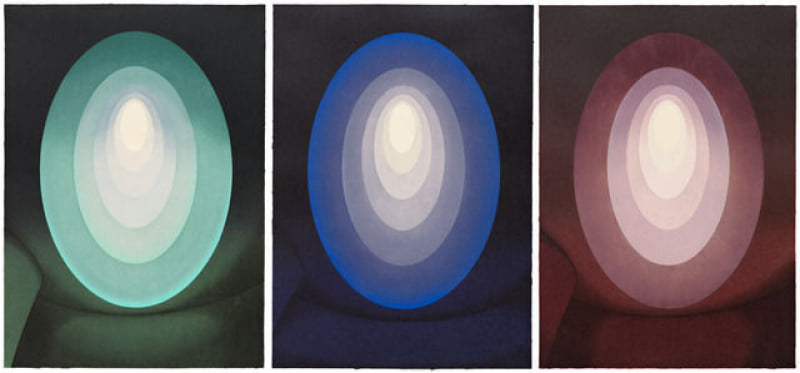 For his 2013 exhibition at the Guggenheim, Turrell created a major installation entitled Aten Reign, radically transforming the museum in the tradition of his most sweeping, large-scale projects. For the first time, the Frank Lloyd Wright–designed rotunda could be experienced only from below, as a volume of space floating overhead rather than a transparency to be looked across. No objects occupied the rotunda, aside from the structures the artist required to reveal and amplify the luminous nature of the space. Turrell proposed an entirely new encounter with the building, drawing attention away from the boundaries of the built environment toward the interior and fashioning what he has described as “an architecture of space created with light.” In Aten Reign, daylight from the museum’s oculus streamed down to light the deepest layer of a massive assembly suspended from the ceiling. Using a series of interlocking cones lined with LED fixtures, the installation surrounded this core of daylight with five elliptical rings of shifting, colored light that echoed the banded pattern of the museum’s ramps. As is typical of Turrell’s work, the apparatus that creates the effect is mostly hidden from view, encouraging viewers to interpret what they see by means of their own perception. The work promotes a state of meditative contemplation in a communal viewing space, rekindling the museum’s founding identity as a “temple of spirit,” as articulated by Hilla Rebay, the Guggenheim’s first director and a pioneer in the promotion of nonobjective art. These prints were made following this exhibition. Video on the Guggenheim show