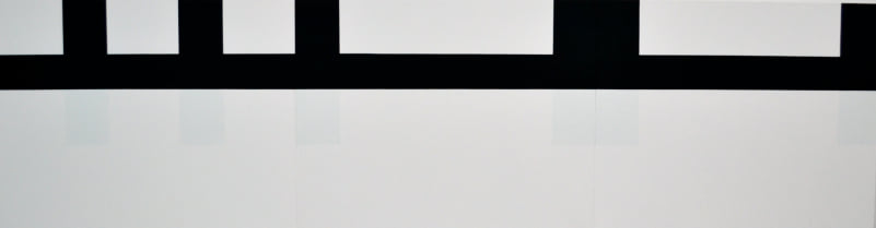 In Symmetrie van het water en Regenboog (ook in onze collectie) plaatst de kunstenaar zichzelf voor het probleem natuurkundige verschijnselen in een schilderij te materialiseren. Hij neemt daarbij een bijna wetenschappelijke houding aan. In zijn schilderijen is het resultaat geen afbeelding van deze verschijnselen maar een benadering van hun wezen, van wat ze in essentie zijn. Regenboog is illusionistisch en atmosferisch. Symmetrie van het water is dat echter allerminst. Het is een geometrische compositie in zwart en wit die door zijn horizontaliteit iets landschappelijks oproept. Door de witte verf heen schemert onder de horizontale zwarte balk de reflectie van de zwarte blokken bovenin het beeld, wat een weerspiegeling als in een wateroppervlak suggereert. Maar van symmetrie lijkt hier geen sprake, want waar is dan die zwarte balk zelf?