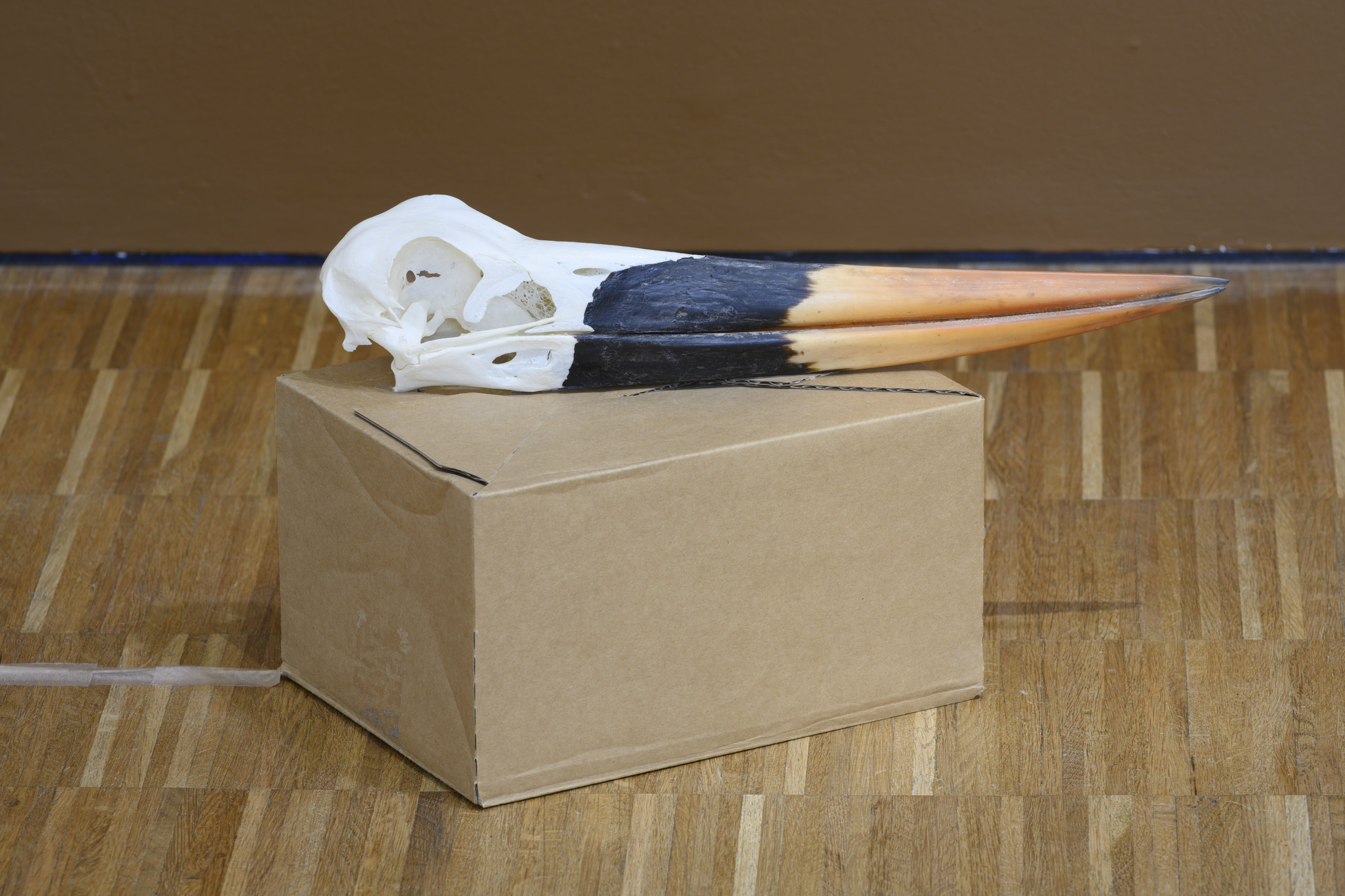 - zadelbekooievaar (Ephippiorhynchus Senegalensis) schedel, printplaat, karton, magneten en MDF (gemaakt in nauwe samenwerking met Gert Aertsen)