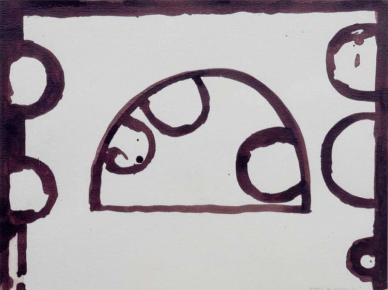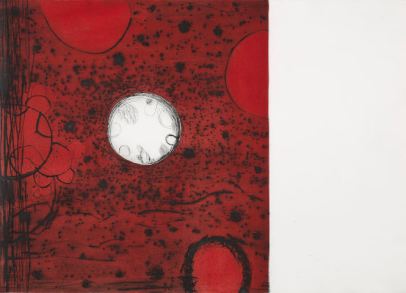 In Zonder titel (1994-1995) verschijnt dit motief nu eens positief dan weer negatief, of binnen een kring van onregelmatige cirkels. Een onderliggend raster van elkaar kruisende lijnen suggereert dat de vormen steeds vanuit het brandpunt van zo’n kruising ontstaan en uitdijen. Overlappingen, en tegenstellingen tussen donker en licht, groot en klein, geven de locaties ook in de diepte reliëf. ‘Hoe ziet de wereld eruit en hoe het heelal? Waar bevind ik me en hoe verhoud ik me tot de rest?’ Zo formuleerde De Goede eens de vragen die hij zich tijdens het werk stelt. Al schrijvend en tastend laat hij mogelijke constellaties zien, waarbinnen begrippen als plaats en identiteit steeds verschuiven.