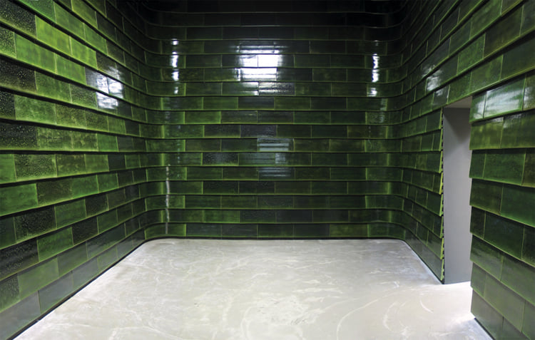 Wie via de onopvallende entree de Groene Kamer betreedt, komt in een ruim en hoog vertrek waarvan de wanden helemaal zijn bedekt met diepgroene geglazuurde tegels. De bezoeker wordt meteen volledig in het werk opgenomen. De tegels hangen in een verspringend motief en horizontaal met de randen over elkaar, terwijl de hoeken met speciale kromme tegels zijn afgerond. De toevoeging Slang in de titel verwijst naar het schubbenpatroon en drukt tegelijk iets uit van de beweeglijkheid die onder dit sobere patroon schuilgaat. Binnen de regelmatige ordening en het ritme van het kader tekenen zich inderdaad talloze kleurnuances af. De groene ‘huid’ is ontstaan door een licht kopergehalte in het glazuur. Tijdens het bakken kristalliseert het koper en ontstaat een metalig effect. De vlekkerige tekening is bij iedere tegel weer anders en valt in het productieproces maar ten dele te sturen.