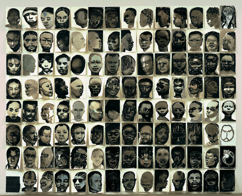 De tekeningen hangen in een blok van acht boven en veertien naast elkaar. In de linker benedenhoek hangt een grijs stuk leisteen in plaats van een tekening op papier. De tekeningen zijn met Oostindische inkt gemaakt. Het zijn portretten van zwarte mensen. Mannen en vrouwen door elkaar, ieder met een heel eigen gelaatsuitdrukking en haardracht. Sommigen dragen een hoofddeksel. De tekeningen lijken met een grote vaart gemaakt. Soms volstaan enkele streken om tot een karakteristiek portret te komen. De vervloeiende inkt geeft de hoofden vorm en expressiviteit. Naast meer uitgewerkte portretten zijn er ook enkele schematische en bijna abstracte ‘koppen’.