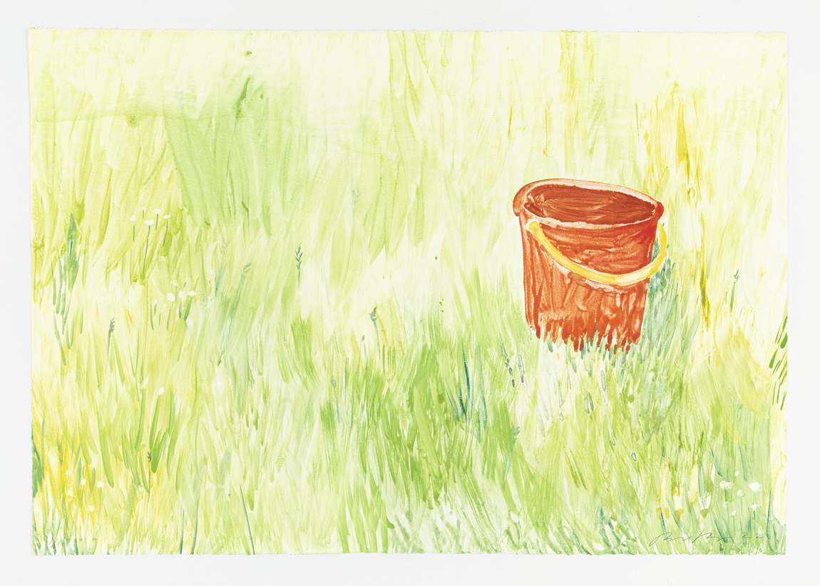 Een monotype is een eenmalige afdruk waarbij een glad oppervlak met acrylverf, olieverf of drukinkt wordt beschilderd. Vervolgens wordt daar een vel papier op gelegd. Door op de achterkant van het papier te wrijven ontstaat een (mono) afdruk. Kjartansson’s unieke Empty Buckets I-IV (2022) serie is exemplarisch voor zijn speelse en relativerende opvatting van het kunstenaarschap. We zien vier bladen waarop een graslandschap met kleurige emmers is voorgesteld. Op het eerste blad is één emmer afgebeeld. Op het tweede blad staan twee emmers, enzovoort. Het is een haast nihilistische reeks waarop elke poging tot interpretatie lijkt af te ketsen. Want wat doen die emmers in dat gras en waarom een reeks van vier? De kunstenaar zelf zegt dat hij met deze serie “countryliedjes over niets” wilde maken als eerbetoon aan de Texaanse country and western zanger Tom T. Hall, die elf nummer 1 hits op zijn naam heeft staan. Kjartannson is een groot bewonderaar van Hall vanwege zijn enorme productiviteit en vanwege de lichtheid en eenvoud van zijn liedjes: “Hij stond elke ochtend op, dronk koffie en schreef een liedje”. De Empty Buckets serie kenmerkt zich door eenzelfde houding: kunst is reguliere dagelijkse arbeid. In dit geval lijkt de kunstenaar er ook in geïnteresseerd een plaagstoot uit te delen aan het adres van hen die aan alles in de kunst diepgaande betekenissen willen toekennen.
