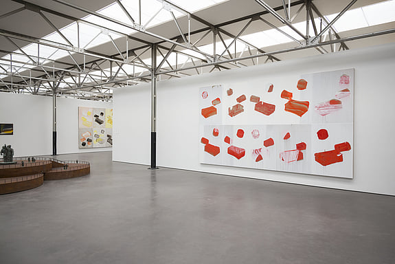 Dit enorme doek heeft een heldere structuur - een stramien van twee horizontale rijen met vijf gelijke vlakken naast elkaar. Binnen die vlakken zien we steeds dezelfde beeldelementen, een doosvorm en korte cilinders, zwevend of vallend tegen een haast monochrome achtergrond. Het schilderij is ontstaan door een ingewikkeld procedé met acrylverf, huiden van acrylaat en uitermate dun opgebrachte olieverf.