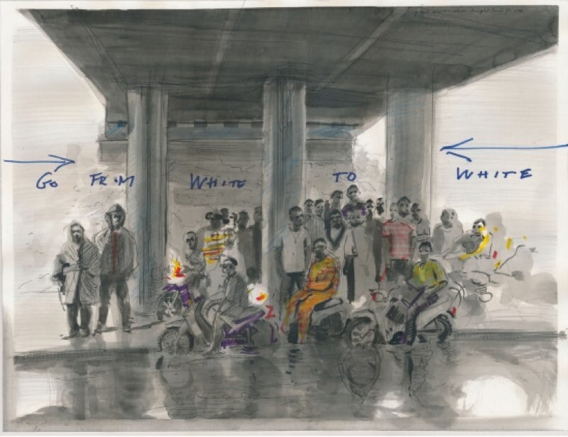 - gewassen inkt, viltstift, acrylpen en potlood op papier