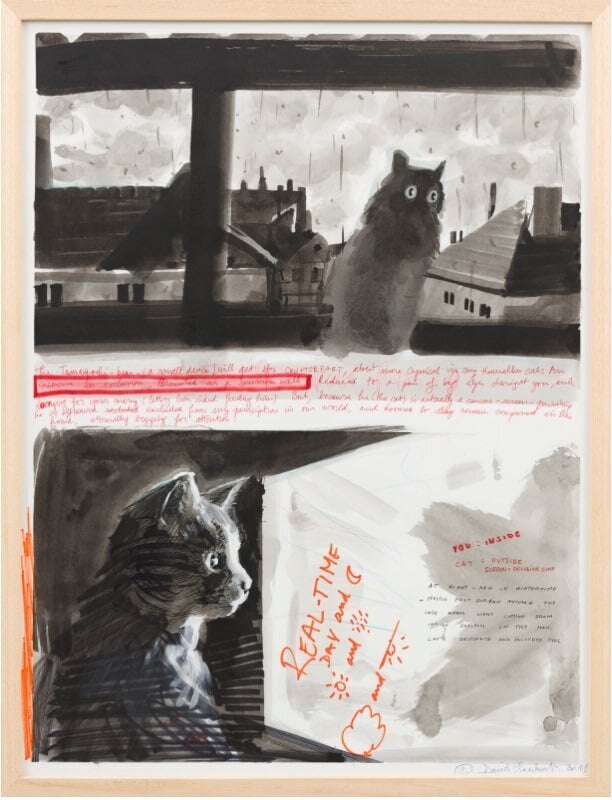 Dit geldt ook voor Shadow Piece (2005) in de collectie van De Pont; een zwart-wit videoprojectie waarin we de glazen pui met toegangsdeuren van een gebouw zien. Het beeld is van binnenuit opgenomen waardoor een deel van het interieur zichtbaar is en door de glaswand het trottoir te zien is. Met regelmaat komen er voorbijgangers in beeld waarvan sommigen het pand in willen. Hierdoor ontstaat de indruk dat het om een openbaar gebouw of een kantoor gaat. De bezoekers vinden echter de deuren gesloten en ondanks hun pogingen deze geopend te krijgen, blijft de toegang gesloten. Uiteindelijk lopen de bezoekers dan weer weg en verdwijnen uit beeld.